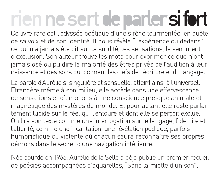 Rien ne sert de parler si fort. Aurélie n’a pas entendu la moindre miette d’un son depuis sa naissance. Elle a souhaité venir à la rencontre du monde des Entendants comme personne ne l’a jamais fait, pour faire partager sa souffrance, son sentiment d’exclusion et d’isolement, son cheminement intérieur, sa quête d’identité.